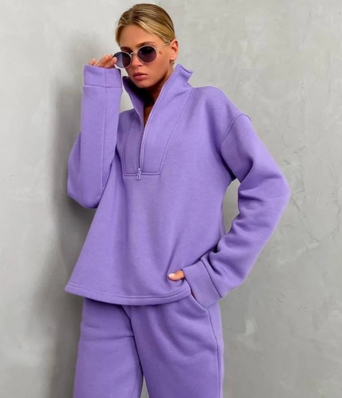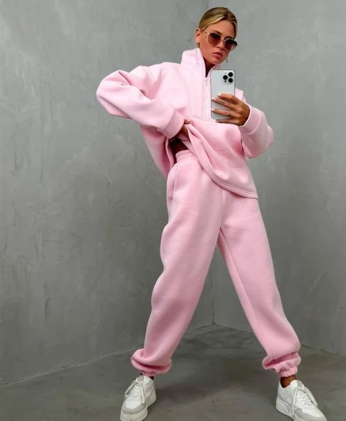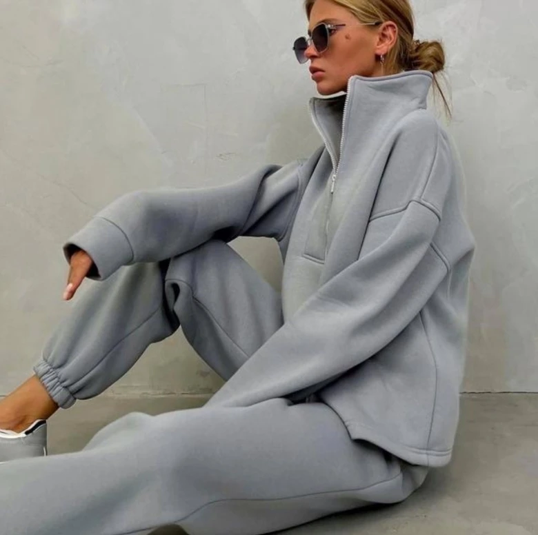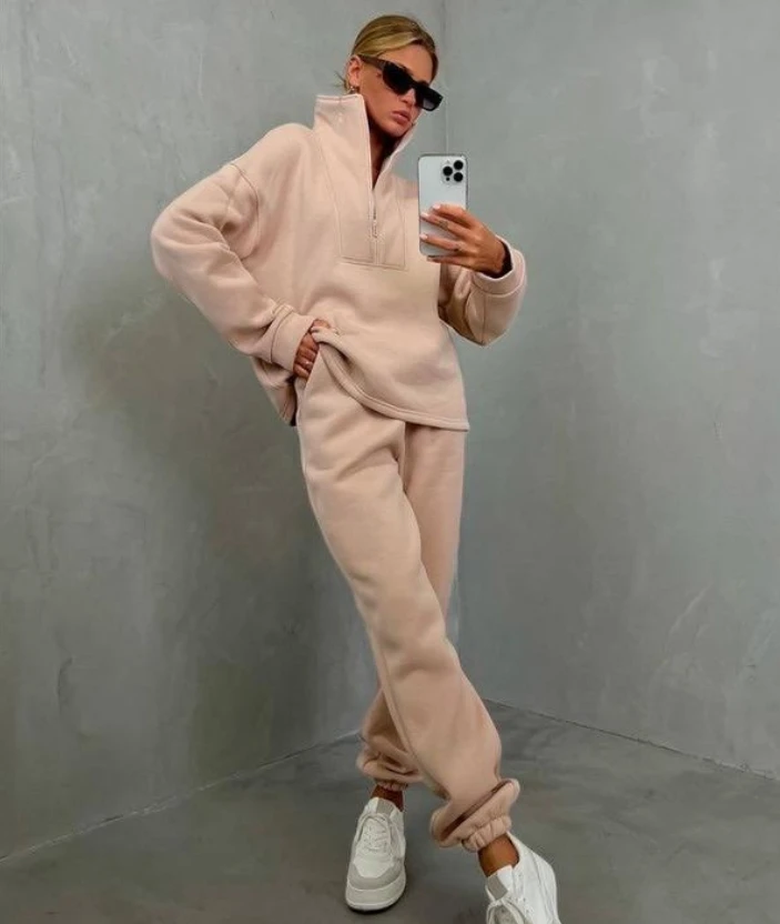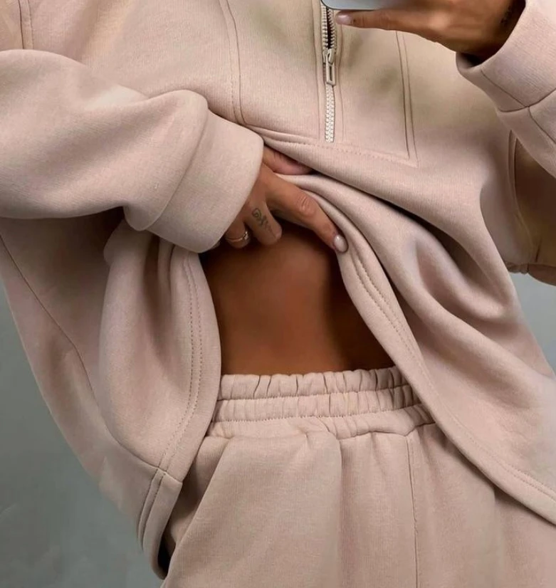 Custom Logo Jogger Set Cotton Fleece Hoodies Oversize Half Zip Tracksuit Sweatshirts and Sweatpants Sweatsuits Set Women-Khaki